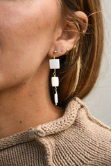Hand made in out Laguna Beach boutique from shell beads and 14k gold filled wire. These drop earrings are elegant while having a nod to the ocean.