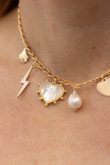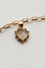 14k Gold filled bold mother of pearl shimmer heart finished with bead drops along its edge. Add some love and texture to your necklace with this charm. Hand make your custom charm necklace in Laguna Beach or build your piece online through adding a base necklace and your selection of charms. Leave us a note on your order for any special requests.