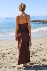Luxe satin sleeveless slip style maxi dress with tie front details. This cocoa dress is unique and beautiful. Dress up with heels or wear a white tee under with sneakers for more of a daytime look.