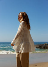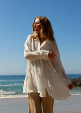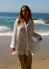 Long sleeve collared swing style dress in a lightweight, textured crinkle fabric. We love the cool sheer texture of the fabric, and how comfortable and airy this dress is. You can easily take this dress from day to night by pairing it with some chunky sneakers and a denim jacket, and then switching to some heels for an evening out.