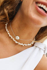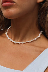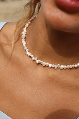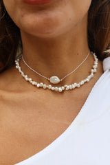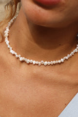 Hand made fresh water pearl necklace with a dancing asymmetrical look. This piece is timeless yet whimsical.