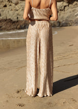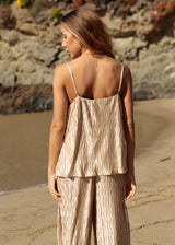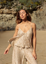 Evening cocktail satin matching pants set with a double layer sleeveless top and a high rise trouser. We love the crinkle plisse texture of this set and how it catches the light. Wear with some gold heels or boots and some bold jewelry for a full on Donna Summer retro 70s inspired look.
