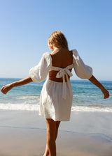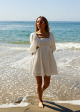 Square neck white cotton mini dress with dramatic puff sleeves and a flare silhouette. The Elm Mini Dress is what we call a sun-dress-showstopper. With dramatic puff sleeves and a swooping low side, this dress makes for memorable photos for your graduation, homecoming, or vacation. We also love how comfortable and breathable the cotton fabric is--making it the perfect sun dress.