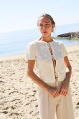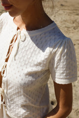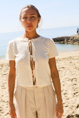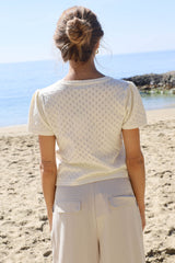 Short sleeve pointelle knit sweater with triple tie front. This top features scallop hem details and a puff sleeve. Wear as a top with a cami under or as a light layer over a dress for spring/summer.