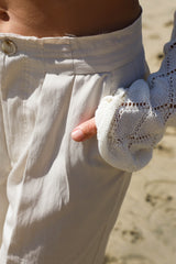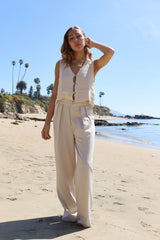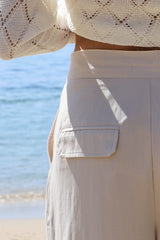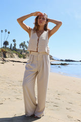 Raw edge high rise trouser with front pleats, pockets and back faux pockets. These are a great fabric for summer in a timeless silhouette. Pair with a tank and sneakers for a day of walking around Laguna or Dres up with heels and a satin top for evening.