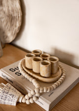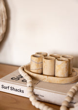 Hand made marble shot glasses in a beautiful honey tone. These artisan made shot glasses are the perfect statement piece for an open shelf or bar cart.