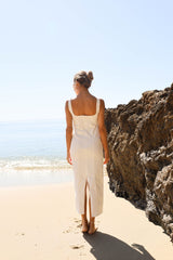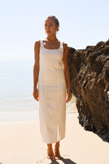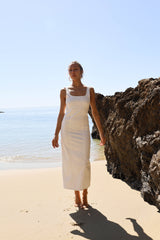 Bodycon maxi white denim dress with princess seam details and back slit. The scoop neck and fitted bust make this piece wearable for any event. Dress down with sneakers for day time or pair with some platform sandals and accessories for an evening look.