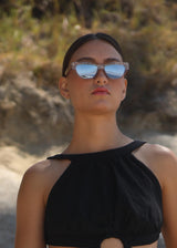 Finished in a striking metallic glitter finish with tonal mirrored lenses for a chic '90s look.
