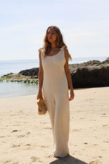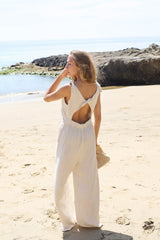 Tie strap sleeveless linen blend jumpsuit with twisted open back detail. This jumpsuit features a loose fitting legs with a back elastic waistband of a breezy beach fit that is comfortable yet flattering.