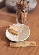 Simple and easy to burn, just light the end of a stick and keep the flame burning for about a minute. Blow out the flame and blow gently to keep the embers smoking to emit the beautiful fragranced smoke that will leave a lasting scent for several hours. Place the burning wood on our offering bowl protect surfaces.