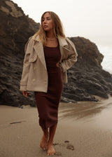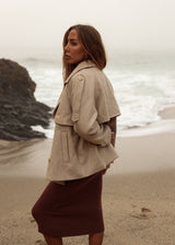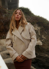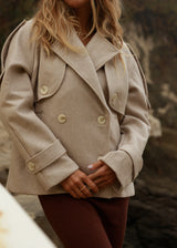 Double breasted half trench style jacket with storm flaps and shoulder tabs. The show-stopper coat of the season is here, and we can't get over how gorgeous the Peyton Trench Coat looks and feels. This luxe jacket boasts a comfortable wool blend fabric with jaw-dropping attention to detail. We love the utility style of the storm flaps and shoulder tabs, as well as the button straps at the wrists. This to-die-for neutral mid trench coat is a versatile piece that will take you from fall to colder winter days. We love the texture of this jacket worn over a midi length sweater dress paired with some tall boots.