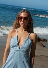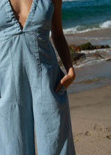 Retro inspired wide leg denim jumpsuit with zip + tie back details as well as a ruchable V neckline. This jumpsuit has princess seam details to bring in the waist and an adjustable back tie for an easy fit. The fabric is ultra soft and breathable for summer.
