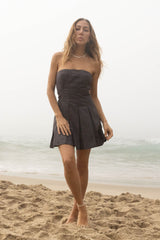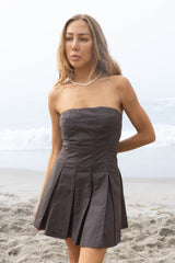 Fun and flirty cotton ripstop pleated strapless dress adorned with back wood buttons. This is a fit and flare style and pairs well with tall boots and a jacket for a chilly day.