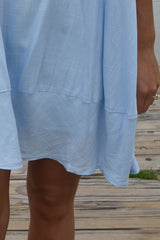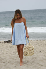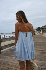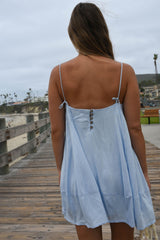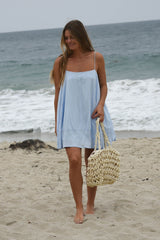 A breezy sky blue spaghetti strap mini dress with princess seams and a unique hem, finished with tie straps and wood back buttons. The ultimate summer throw on and go dress from the beach to day to dinner with an accessory swap!