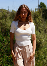 Cropped rib knit t shirt with a corset style V hemline and side cut outs. We love the 00s y2k aesthetic of this top layered over a pair of high rise baggy jeans or cargo pants.