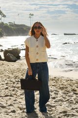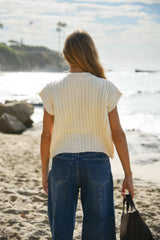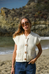 A beautiful chunky knit top with bold metal buttons and front pockets. This short sleeve top is perfect for fall. Layer with a long sleeve or wear alone. Slightly shorter length hair pairs perfect with your favorite jeans.
